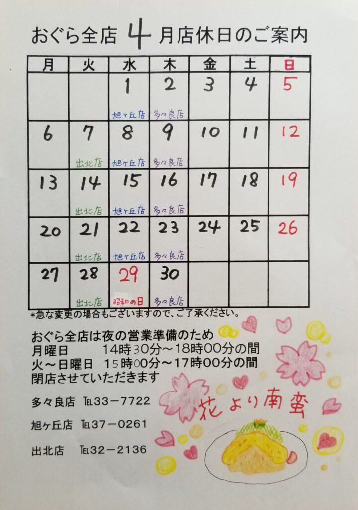 おぐら4月の店休日のお知らせです📢💕