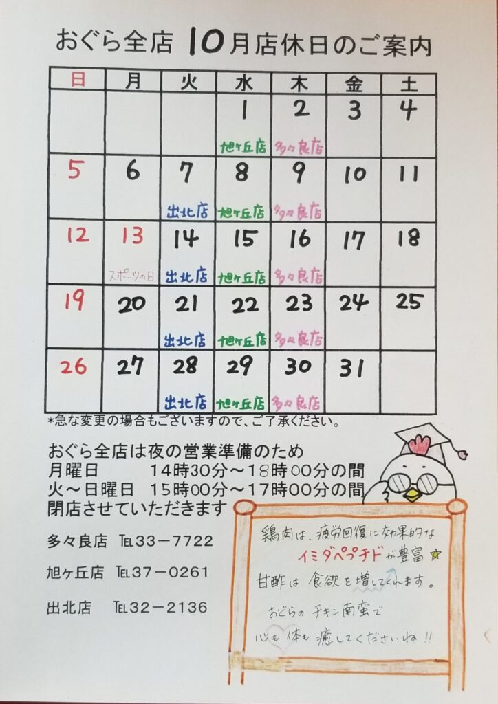 【多々良店】10月 店休日のご案内🗓️