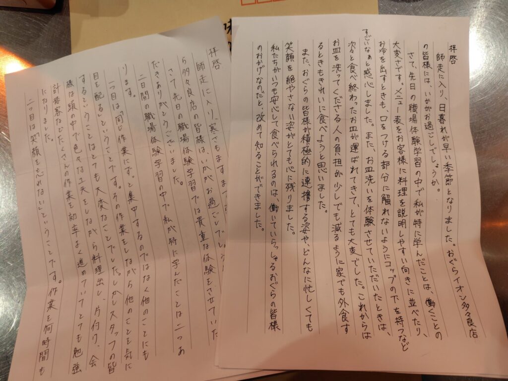先日、職場体験の記事を書きましたが、学生さんたちよりお礼のお手紙をいただきました😊