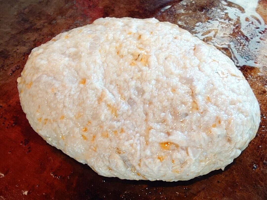 (おぐらでは表面に小麦粉をつけて焼くので、この状態では白いのです)
